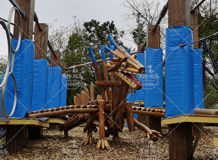 翼龍樂(lè)園區(qū)是利用客戶(hù)場(chǎng)地上原有的立柱,充分將廢棄的場(chǎng)地再度利用,讓已經(jīng)荒廢的場(chǎng)地重裝上陣,成為一個(gè)為用戶(hù)帶來(lái)快樂(lè)的新場(chǎng)地,我們?cè)陉惻f的立柱與立柱之間設(shè)計(jì)了各種造型的趣橋項(xiàng)目,同時(shí)打造生動(dòng)好玩的翼龍攀爬作為連接橋,讓我們的項(xiàng)目好玩又好看。