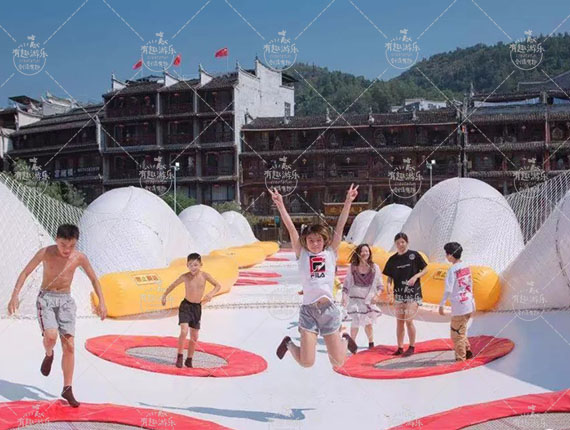 水上魔毯特征:水上魔毯項目建設(shè)在寬闊的水面上,采用充氣軟床、蹦床、繩網(wǎng)等柔性材料搭建一座有趣的軟橋。水上魔毯項目可以讓游客在橋面上彈跳、奔跑、翻滾等作出自由的動作。水上魔毯是景區(qū)、營地中新型的游樂項目